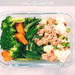 圖中是我的午餐的樣子,有地瓜炒花椰菜、瘦身版麻婆豆腐、清炒a菜,底下有大概兩大匙的糙米飯。 在健身增肌減脂的過