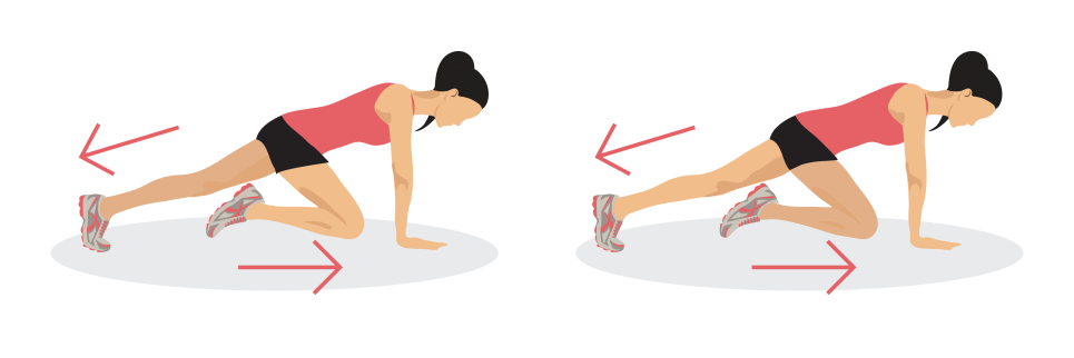 4. 右膝觸及地板後,雙腳伸直向上回到起始姿勢。